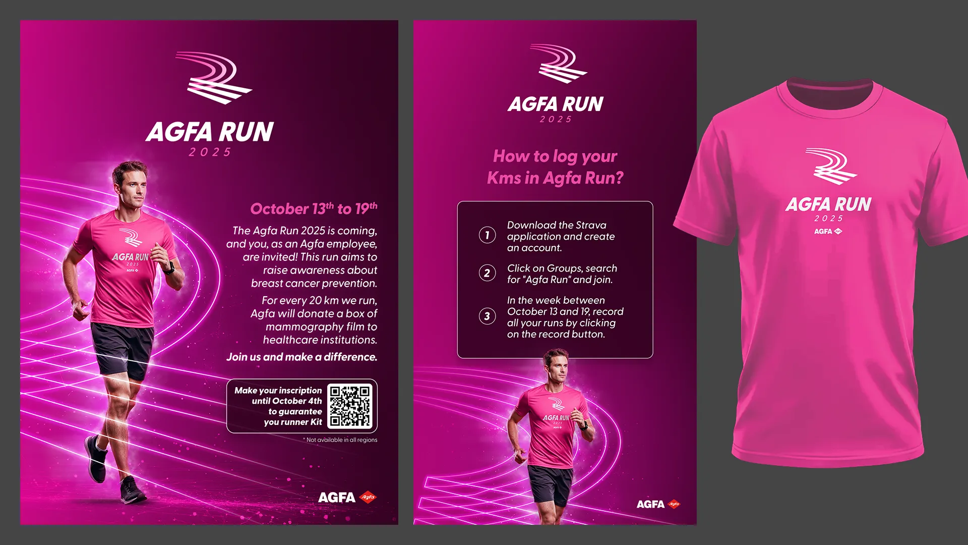 Desenvolvimento da identidade visual e comunicação para o Agfa Run 2026, evento esportivo da multinacional Agfa. O projeto traduziu os conceitos de movimento e integração em peças gráficas aplicadas a uniformes, sinalização e comunicação digital, garantindo consistência global para a ativação da marca junto aos funcionários.
