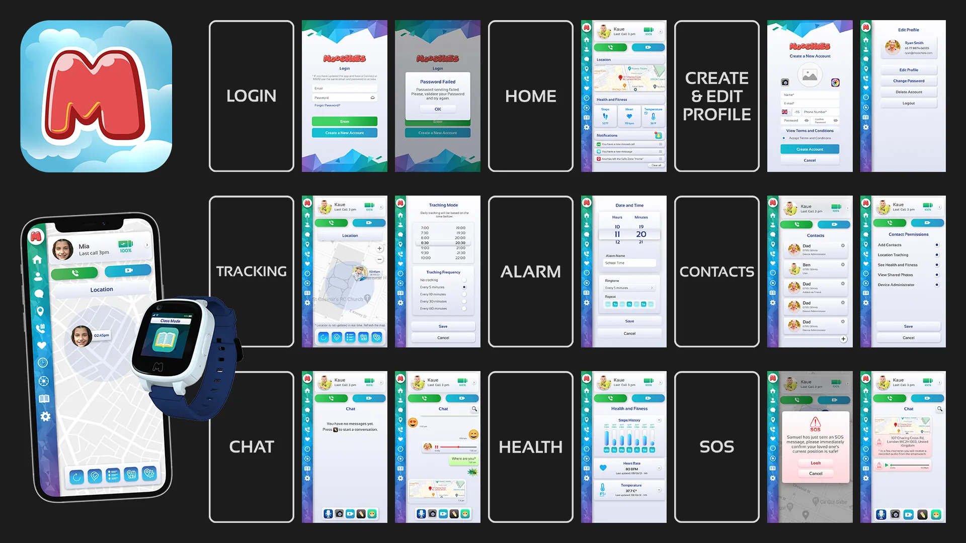 Projeto de UI/UX para a Moochies, focado no desenvolvimento de aplicativos para diferentes modelos de smartwatches infantis e no app mobile complementar. Atuei na definição de fluxos, interfaces e usabilidade, permitindo que pais monitorem, gerenciem e se comuniquem com os dispositivos de forma simples, segura e intuitiva.